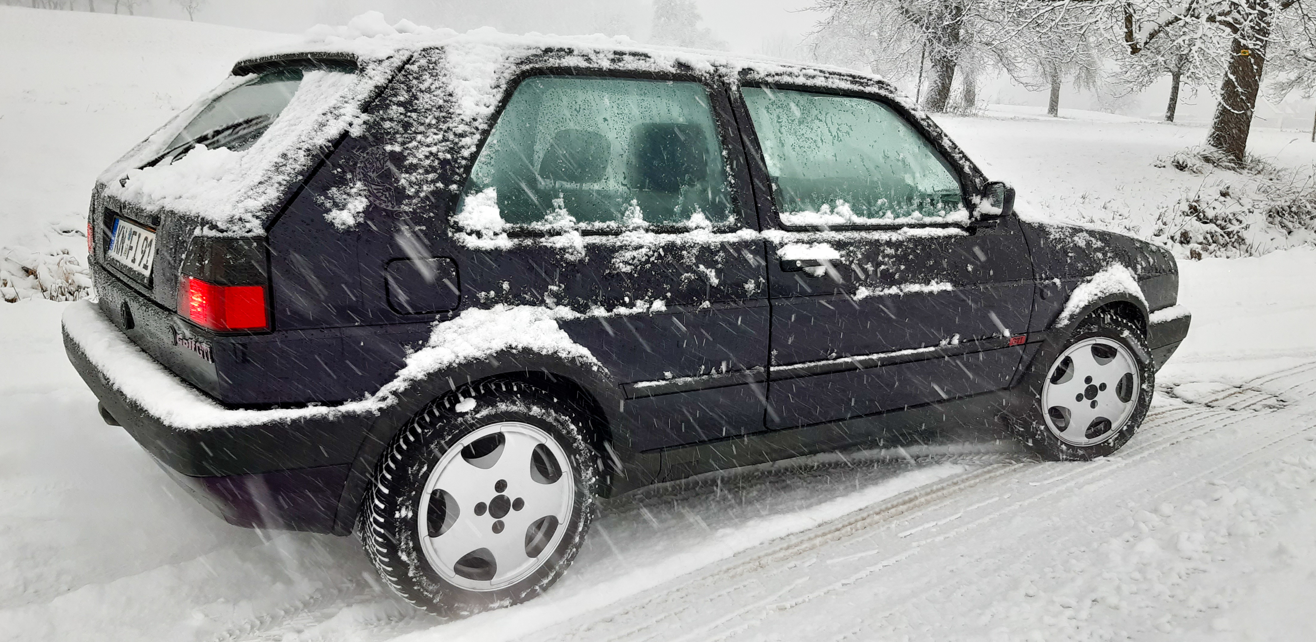 Im Januar hatte ich nun einen Werkstattbesuch und wurde vom plötzlichen Wintereinbruch überrascht - der einzige Schnee übrigens bisher, war eine halbe Stunde später auch in Regen übergegangen. Es war auch kein Winterdienst unterwegs, so dass Salz keine Gefahr war. Wenn man so will "Glück gehabt", denn ich wollte den Wagen schon immer mal im Schnee fotografieren.