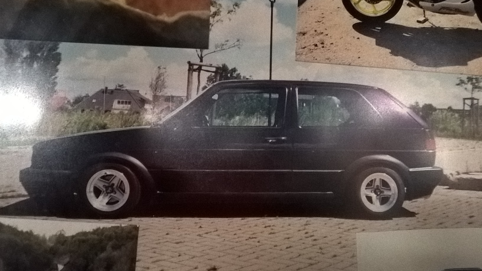 Der Golf stand bei einem Autohändler in Barth, wurde von seinem Kumpel gekauft leider hatte dieser ein Unfall erlitten, einer ist ihm aufs Heck gefahren und wurde dann auf ein anderes Auto drauf geschoben, das dieser einen Karosseriebauer als Kumpel hatte wurde dieser Schaden wieder instand gesetzt, dann hat den später der Lehrling bei dem Karosseriebauer gekauft. Dieser hat die Felgen verkauft und weiße BCW Alus montiert, ebenso nicht mehr so tief.