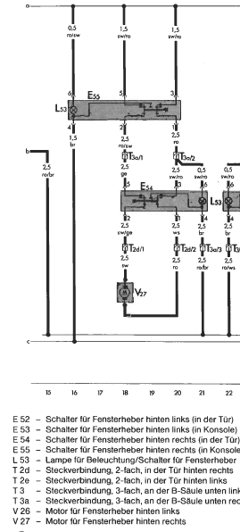 Habs mir grad nochmal angeguckt, schau dir mal zuerst die Masseverbindung des vorderen Schalters an! An der könnts höchstwahrscheinlich liegen. Denn der hintere Schalter hat ne eigene Masse und der Strom muss ja von beiden Seiten zur Verfügung stehen, falls das Fenster hinten nicht nur rauf oder runtergeht.