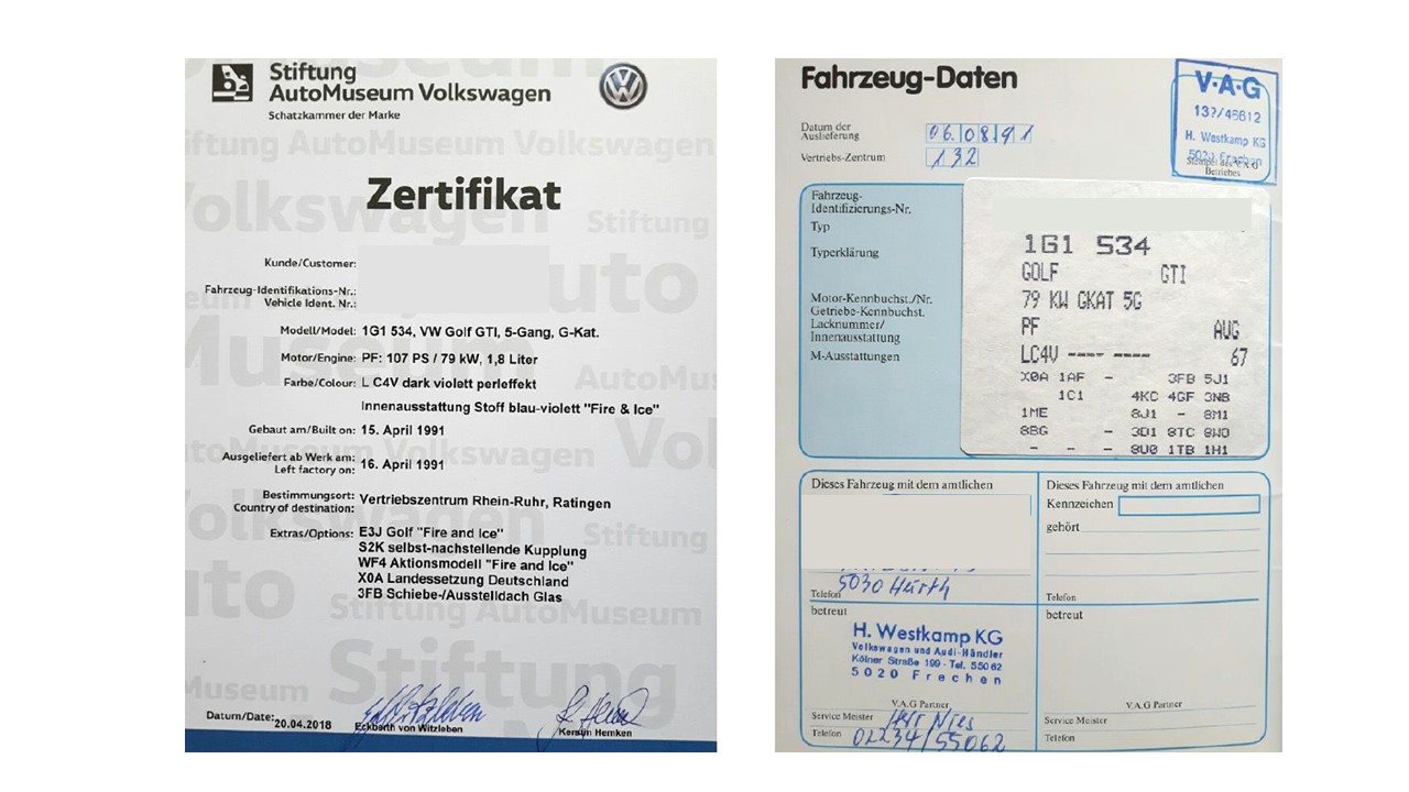 Aufkleber im Serviceheft, im Kofferaum und Bestätigung durch Wolfsburg sind konsistent. Interessant die lange Zeit zwischen Auslieferung und Erstzulassung - stand der in der Ausstellungshalle? Die Firma "weiß" über so alte Daten/Fahrzeuge nichts mehr