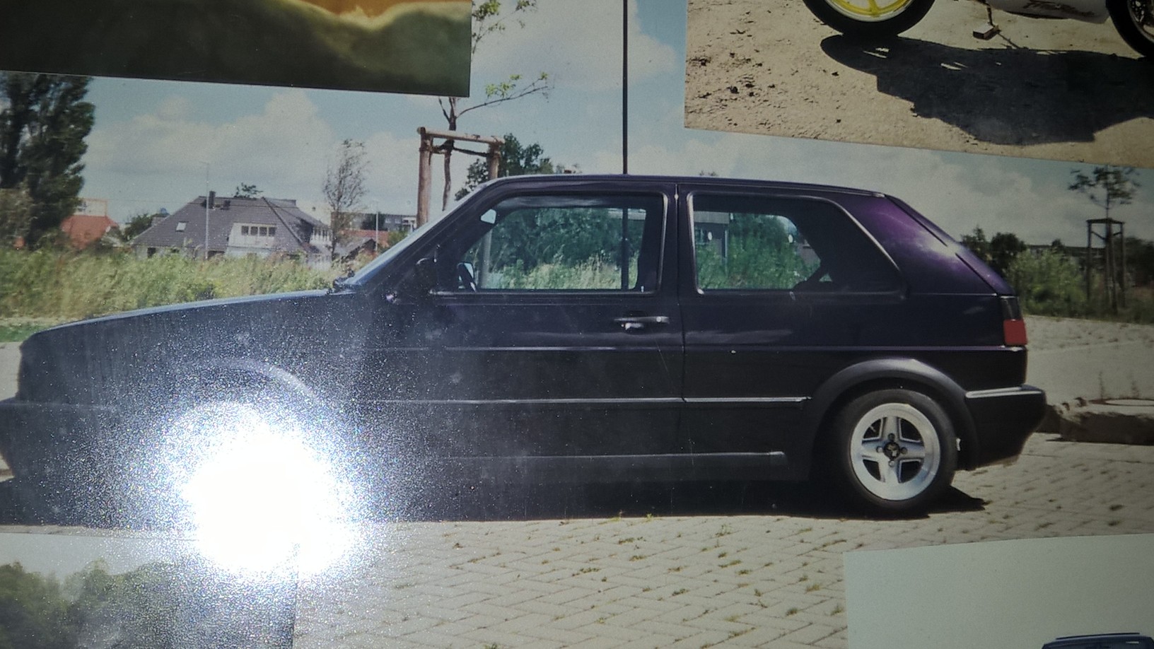 Es war eigentlich ein ganz normaler F&I: 90PS, 3-türig. Verbaut war ein gelbes Koni 80/60 Fahrwerk. Für die Airride-verwöhnte „Jugend“ (von der ich beim Schmökern in diesem Forum aber gar nicht soo viele, eigentlich gar keine gesehen habe ;-)), das war damals schon ziemlich hart und tief-die einzig beiden richtig „wichtigen“ Kriterien damals :lol: . Als Highlight waren 13“ Classic Line Alus von Revolution (bevor sie als Schmidt-Felgen vermarktet wurden) verbaut. Extra importiert aus England und für das Geld damals 4 Wochen in Wolfsburg als Werks-Studie am Band gestanden. Innen war dann ein lila Spielzeug 32er Momo und ein lila Schaltknauf verbaut. Mehr nicht an „Extras“. Die Radhäuser waren damals von mir ziemlich dilettantisch bearbeitet, um Platz für die Räder zu schaffen. War von außen aber nicht zu sehen.